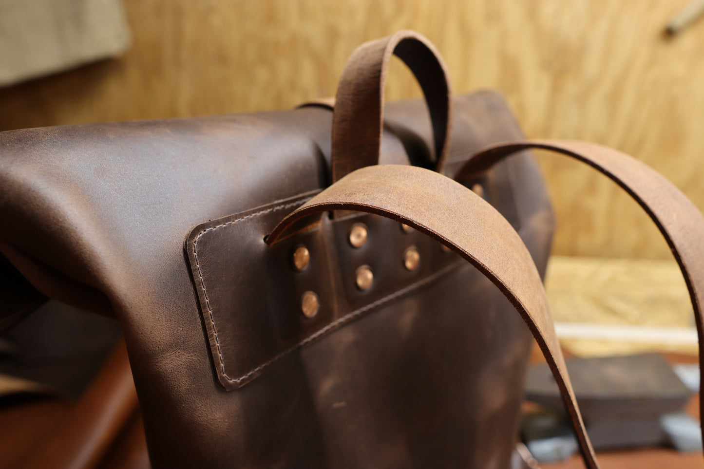 The Rollmop Rucksack is a great travel companion. This large (really, it's huge!) backpack is beautiful and will fit all you need. I use heavy duty materials and tons of copper rivets on this bag to make it sturdy. It's built like a tank, but surprisingly light for how big it is. And because it has a rollmop it is essentially adjustable in size. It can fit a lot or just enough. Perfect for a hiking trip, a tour of the world, or just your everyday tasks around town if you want something bigger than a satchel.