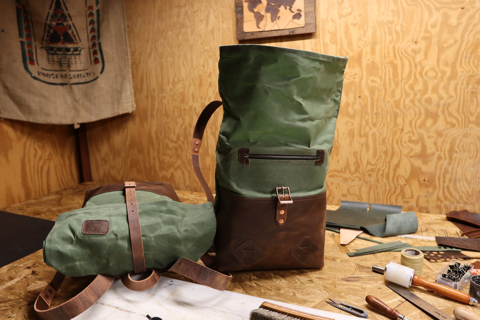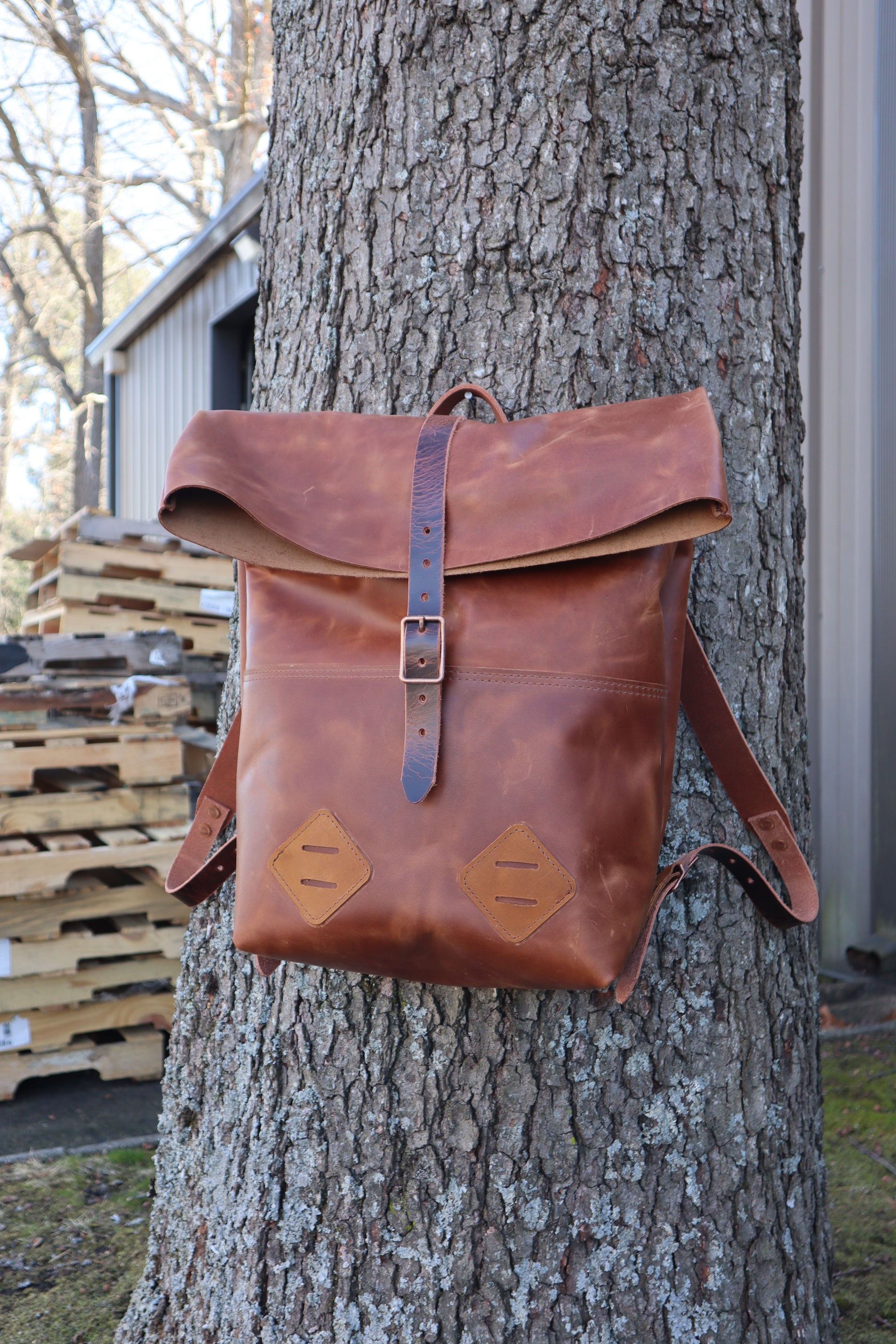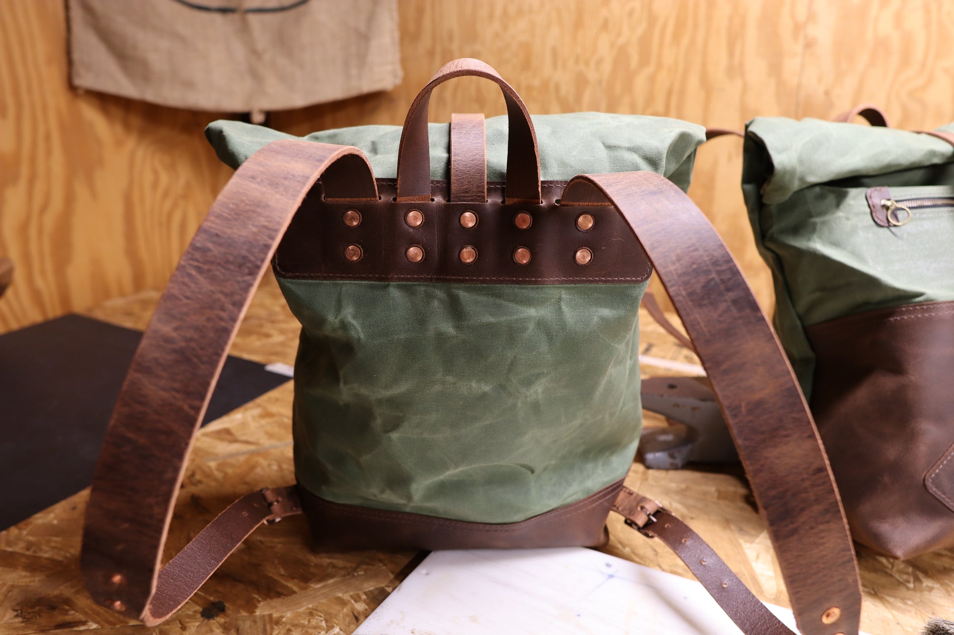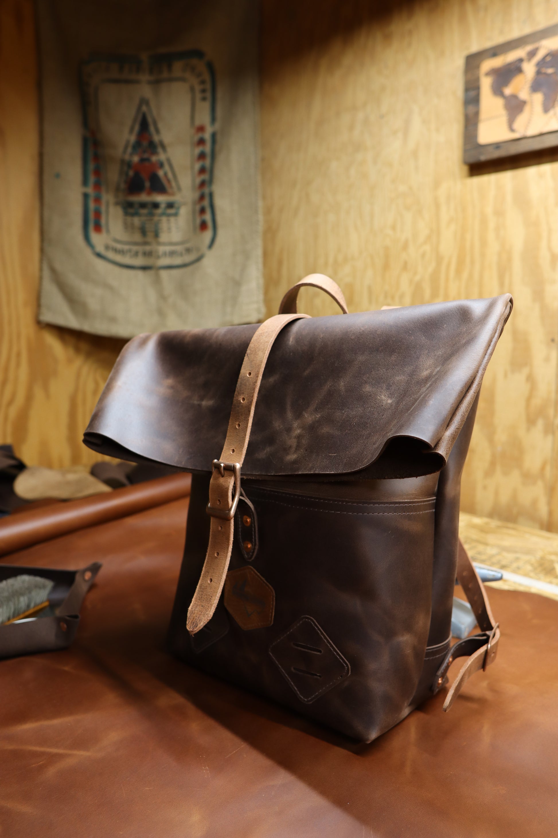 I use heavy duty belt leather for the straps. I can make the bag out of all leather, or part leather and part waxed canvas. Either way, it's water resistant, and ready for all your adventuring.
